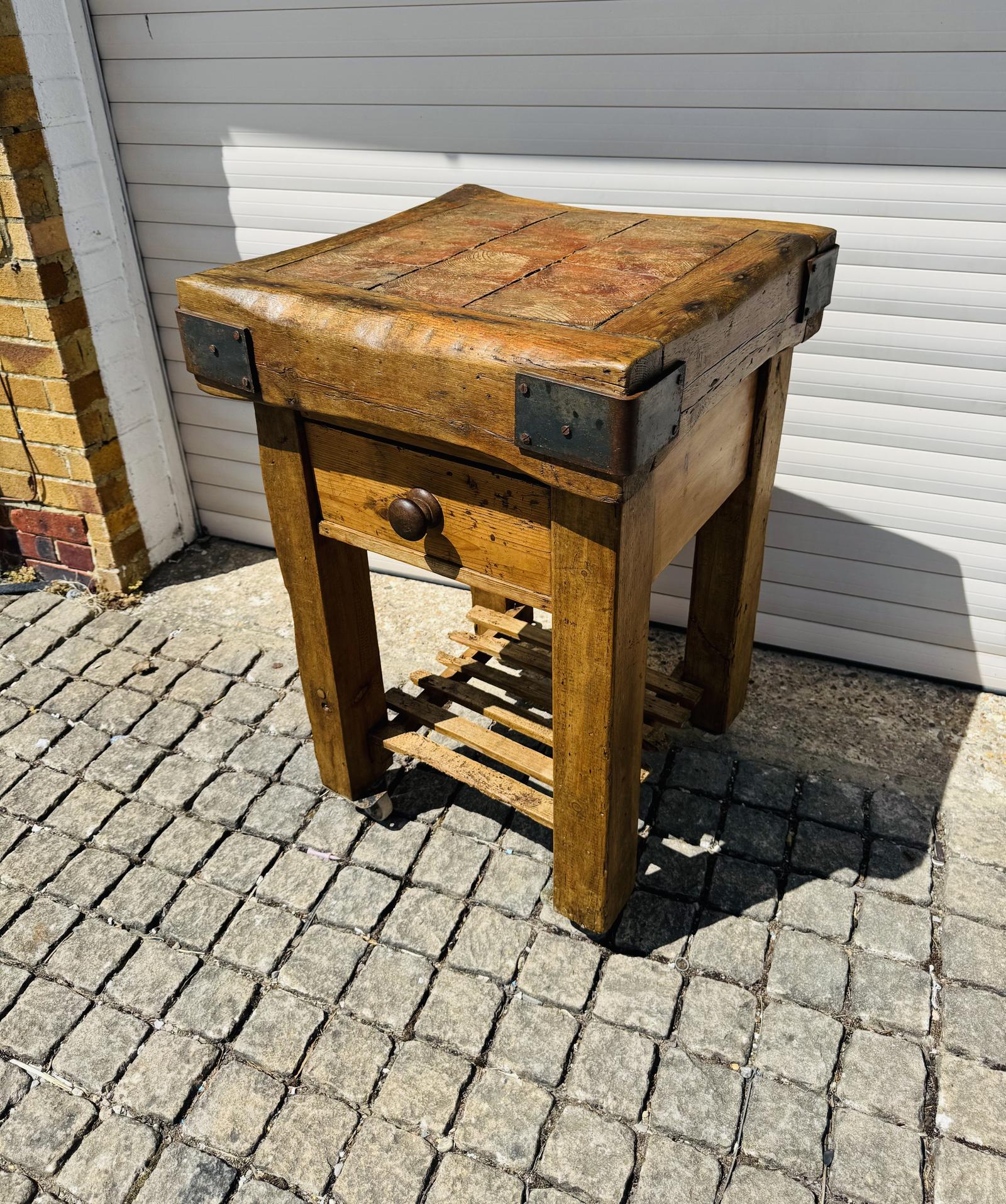 Antique hardwood hinged butchers block on a softwood base with drawer. The block has iron brackets on each corner and it's all very much in original condition. The struts underneath are very worn and easily replaceable if desired, I like to keep items as original as possible and then the new owner can decide. However, these can be replaced by me if requested. On industrial castors.