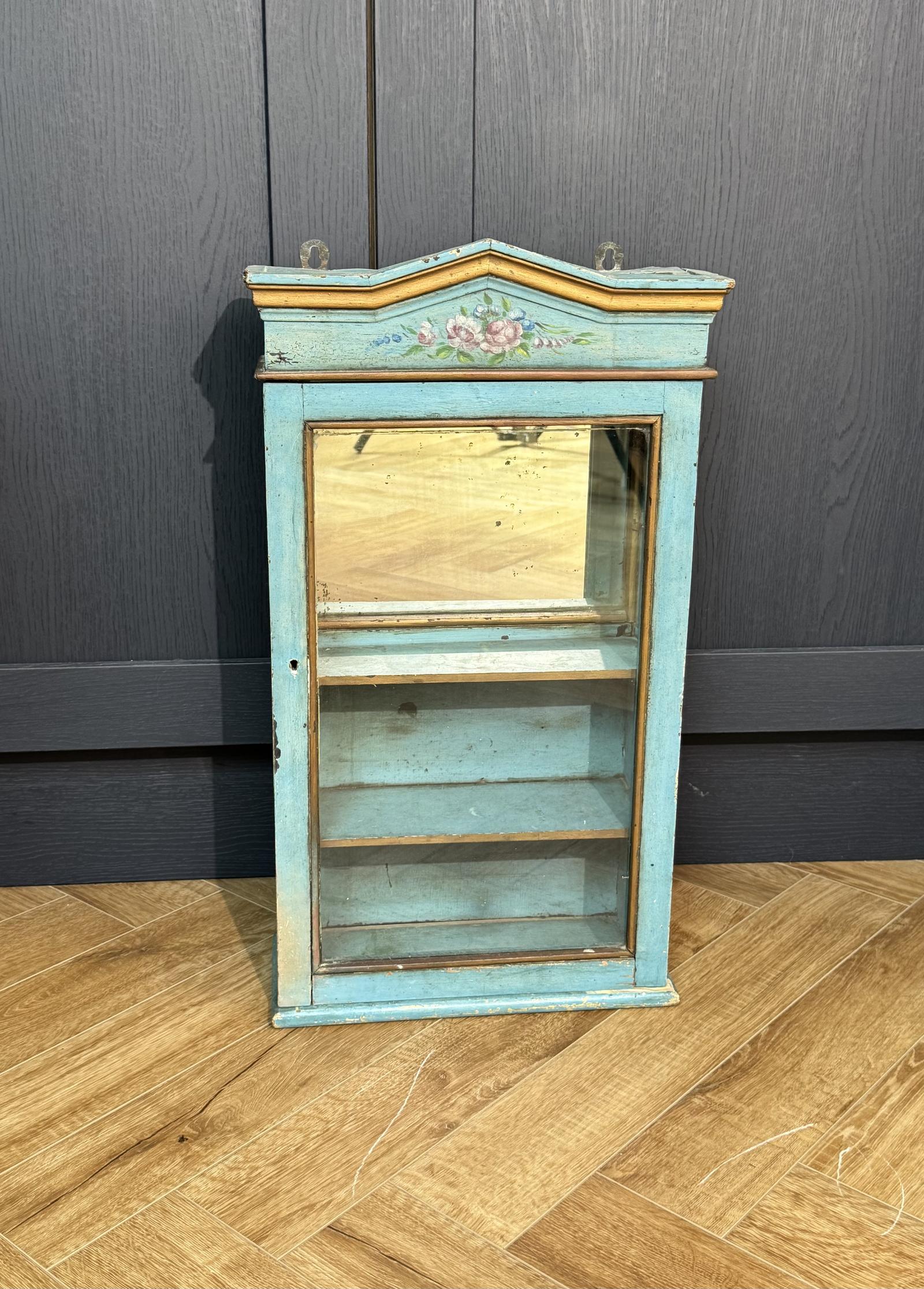 Antique cabinet in original painted powder blue paint, decorative flowers on the top and gold painted mouldings inside and out. There is a mirror on the back so presumably used as bathroom cabinet. Reputedly came from a nunnery.