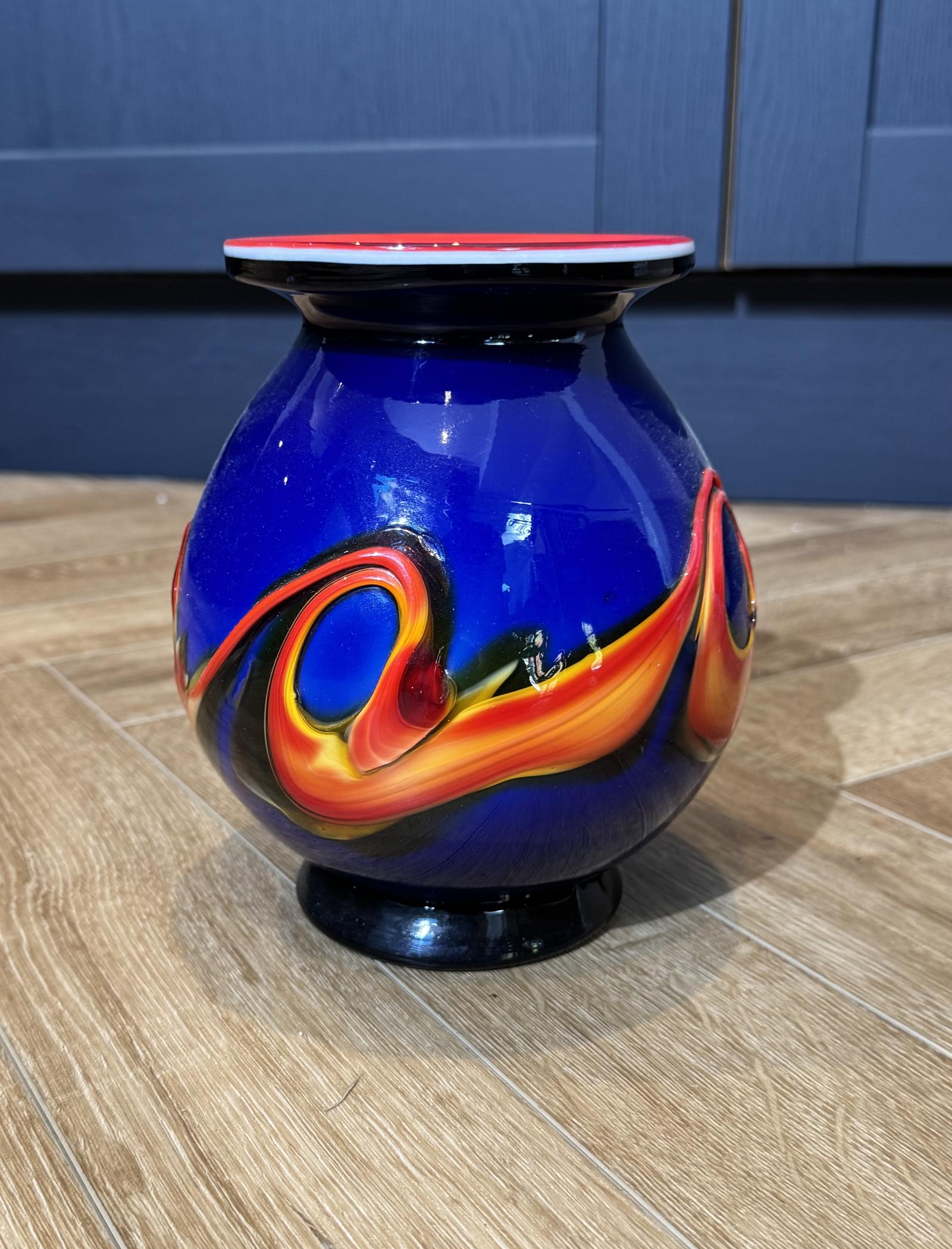 20th century art glass vase in blue with multi coloured swirls around the vase and an orange internal lining with pondtail on the base