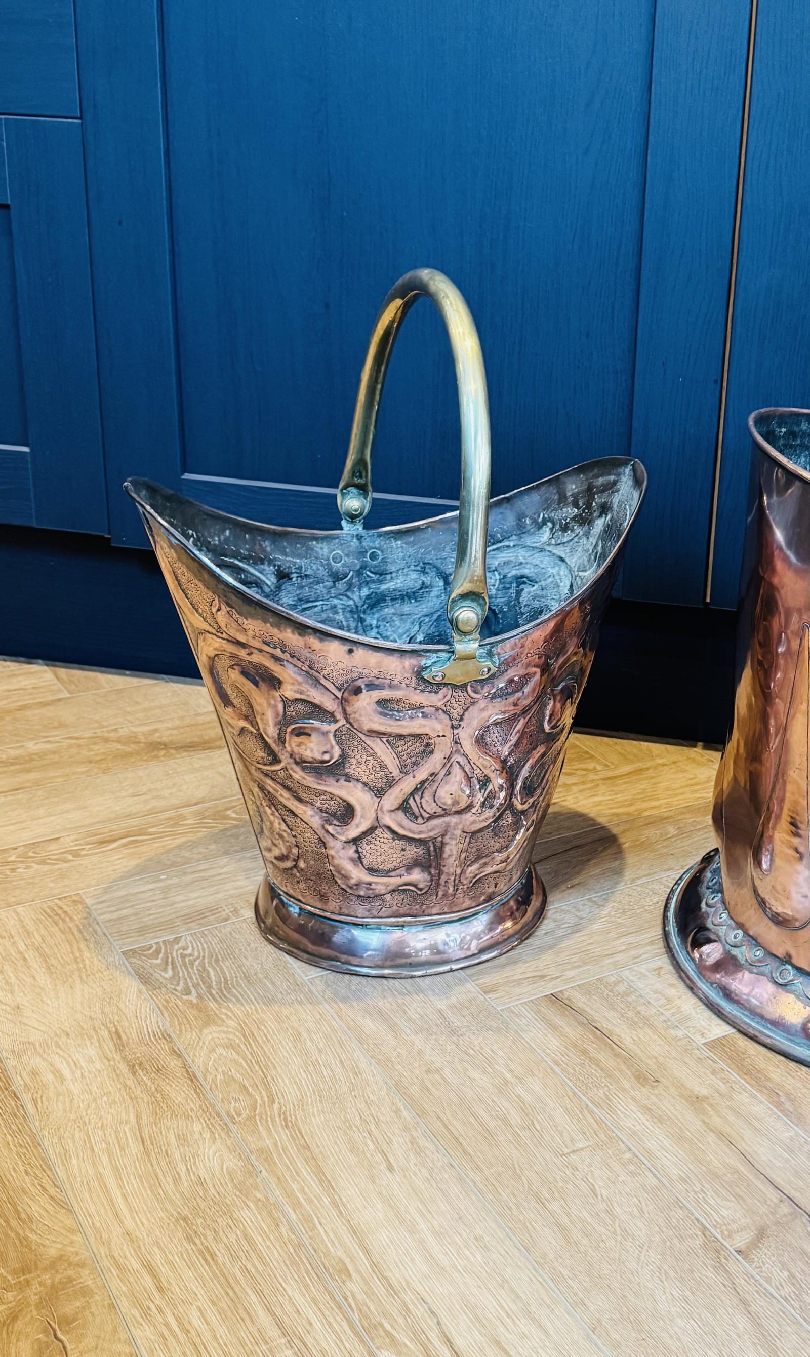 An Art Nouveau copper fireside bucket with a brass handle and lightly polished and in good condition, 49 cm high to the top of the handle.