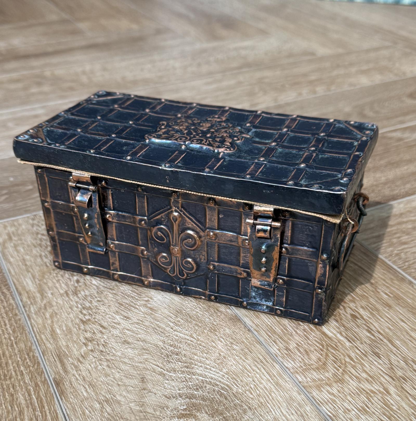Arts and crafts anodised copper box with embossed armorial lid, faux strap work and aesthetic motif on the front. Handle seither side and copper chain attached from the interior to the lid.