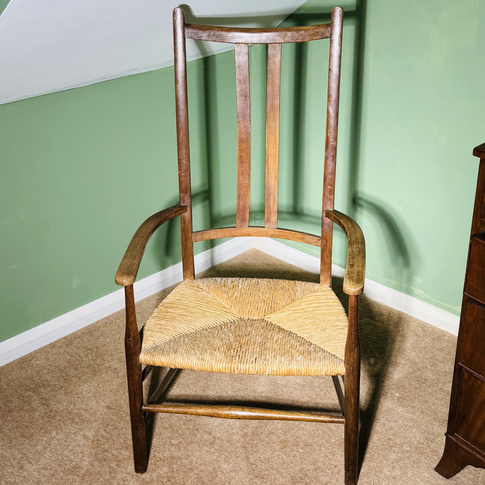 In very good untouched condition and the style is in the manner of Liberty. No damage to the rush seat.