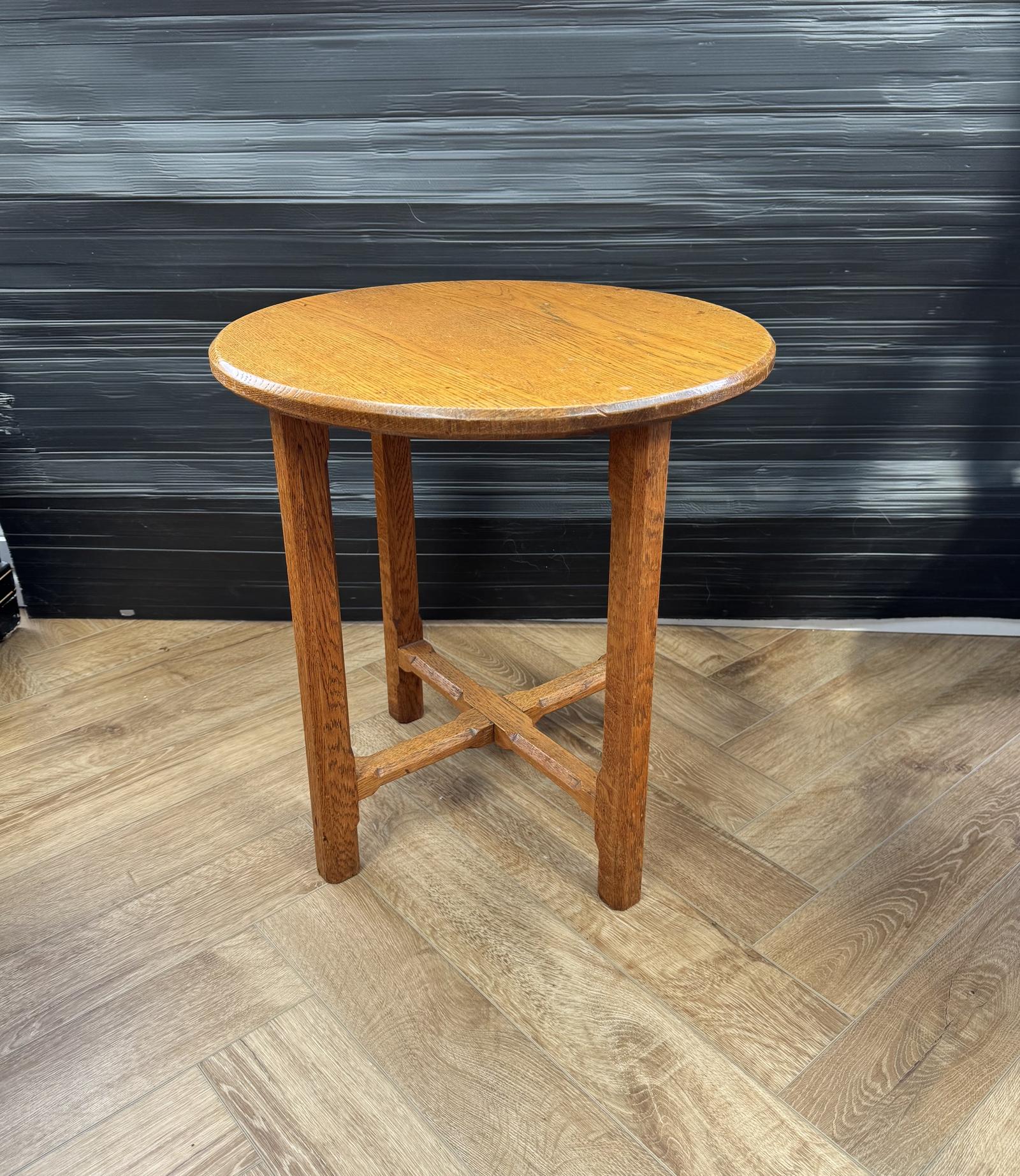 Small oak Arts & Crafts antique oak table with chamfered legs and stretchers joined in the middle under a round top. All in good original condition.