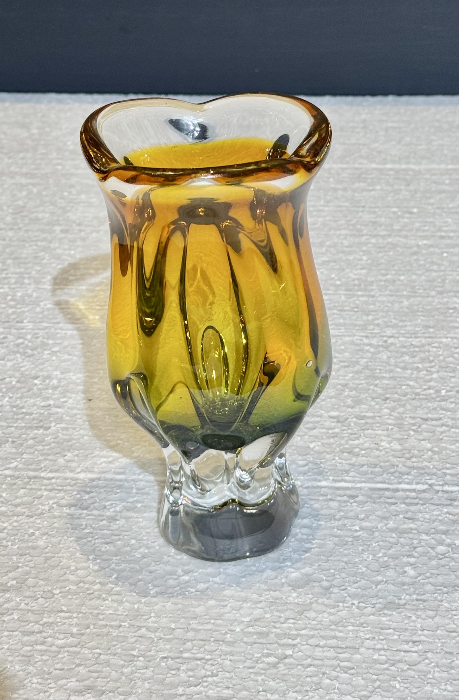 Beautiful Sklarna Chribska, Czechoslovakia art glass vase designed by Josef Hospdka during 1960-70 ( one of twenty vases available). In excellent condition with an sommerso effect in clear, green and yellow.