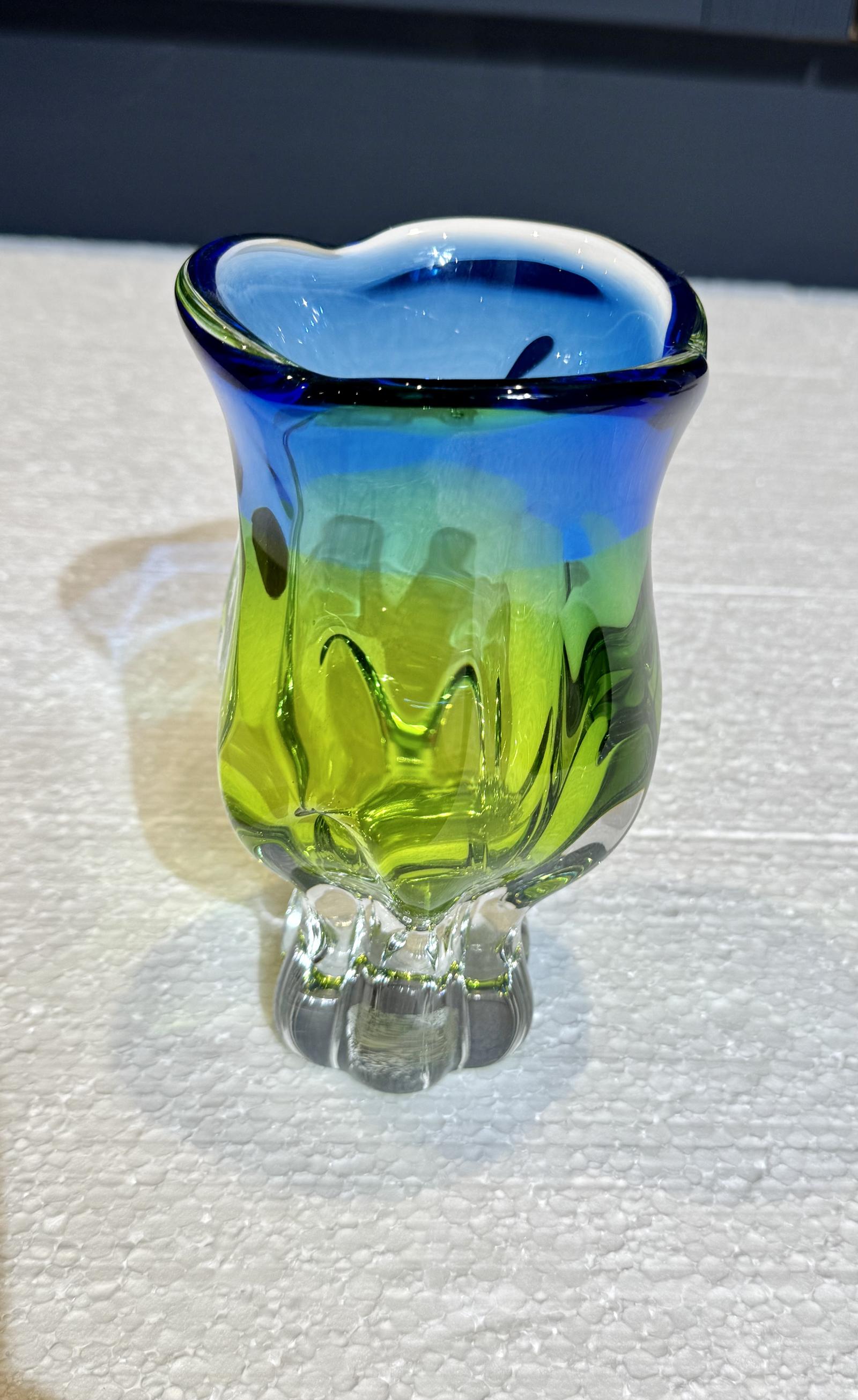 Beautiful Sklarna Chribska, Czechoslovakia art glass vase designed by Josef Hospdka during 1960-1970 (one of twenty vases available). In excellent condition with a sommereso effect in clear, green and blue