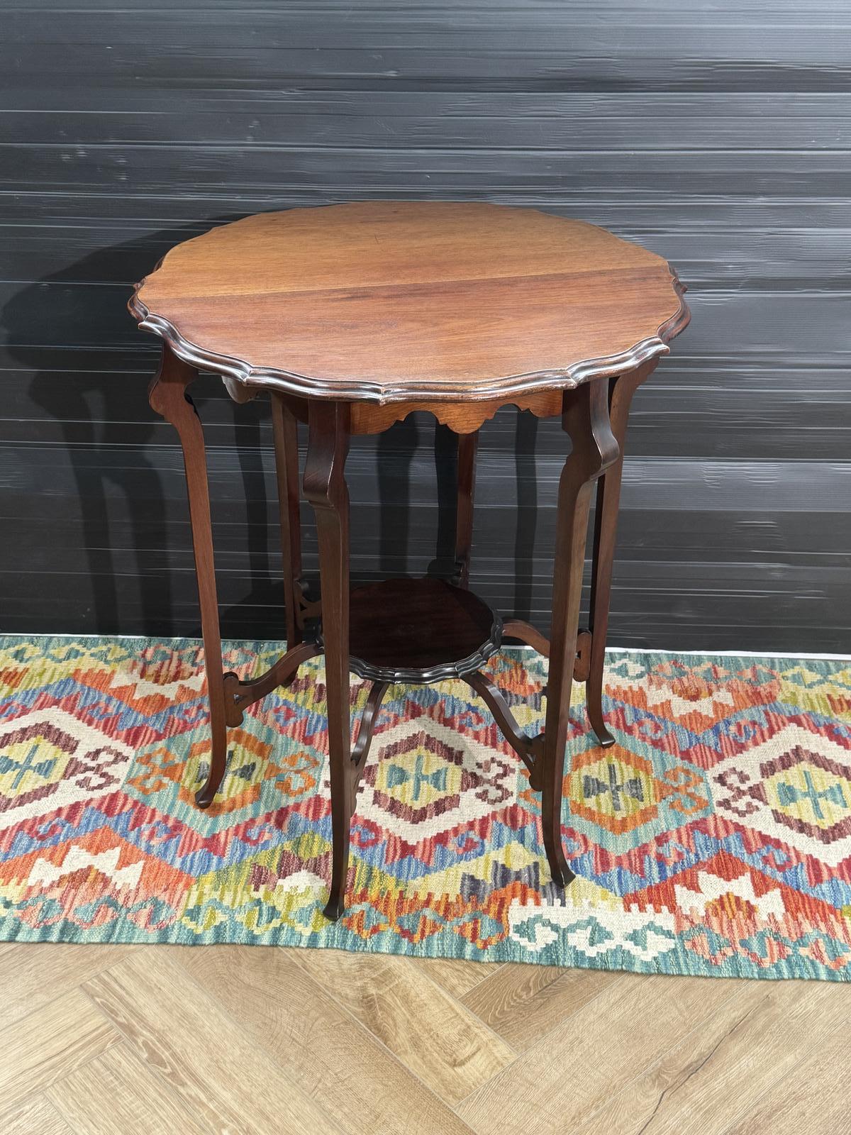 Edwardian mahogany six leg table with a shaped moulded top and a shaped folded underside shelf connected to all six legs by stretchers.