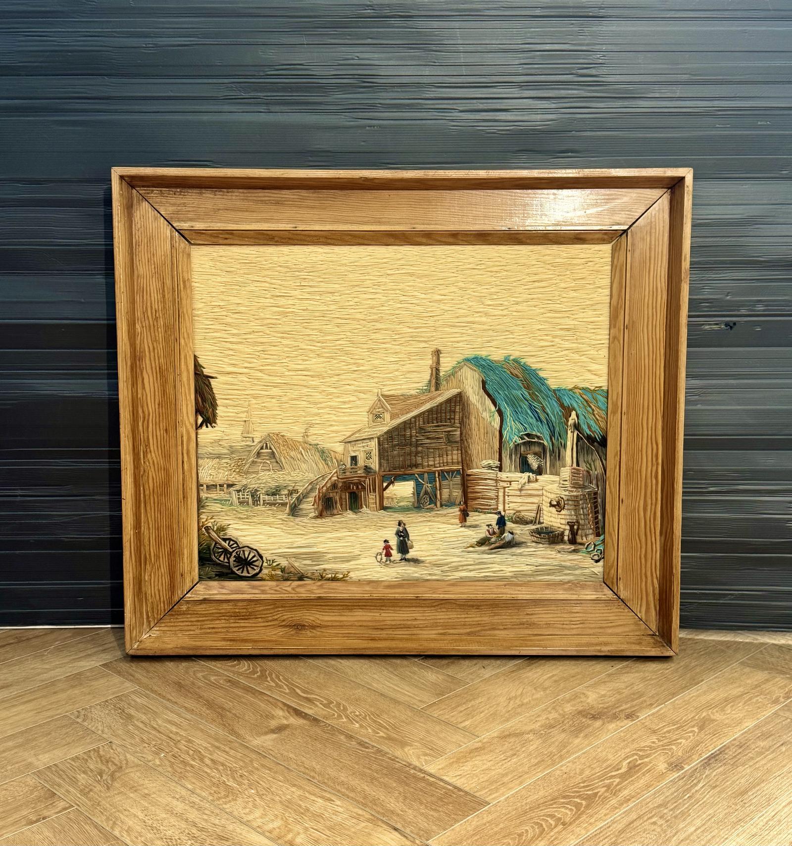 Extremely well constructed tapestry in a substantial pine frame, all in good original condition and of an old country scene.