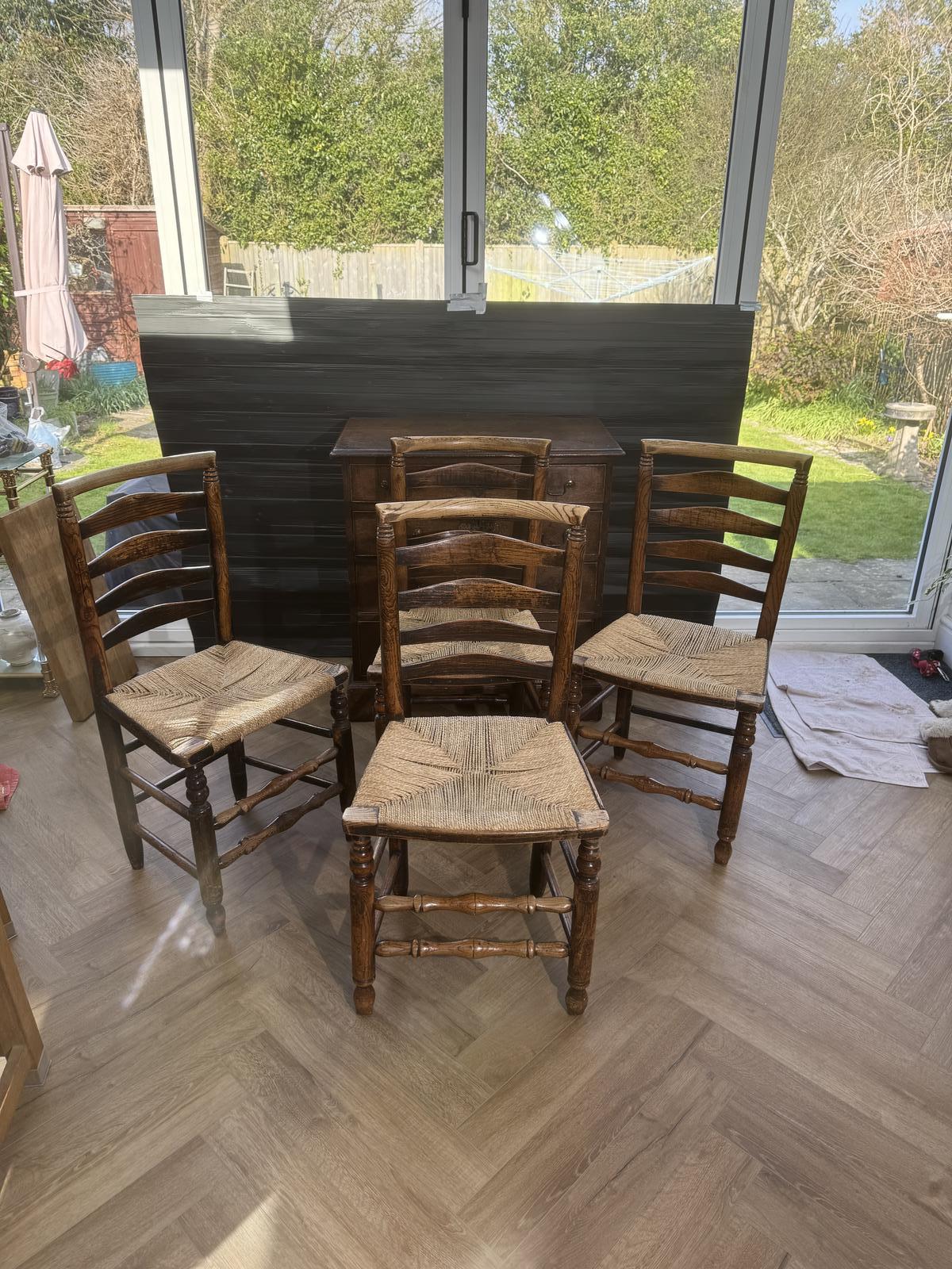 Four 18th century oak and elm Lancashire chairs with seagrass seats, all structurally sound with great patination and age related wear. Unusual turnings on the top of the side supports on the back and double stretchers on the legs.