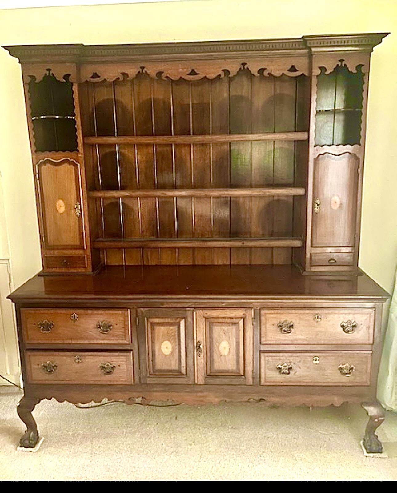 Beautiful oak dresser with mahogany banding and shell marquetry inlays on drawers and cabinet doors with sturdy Chippendale style ball and claw legs.