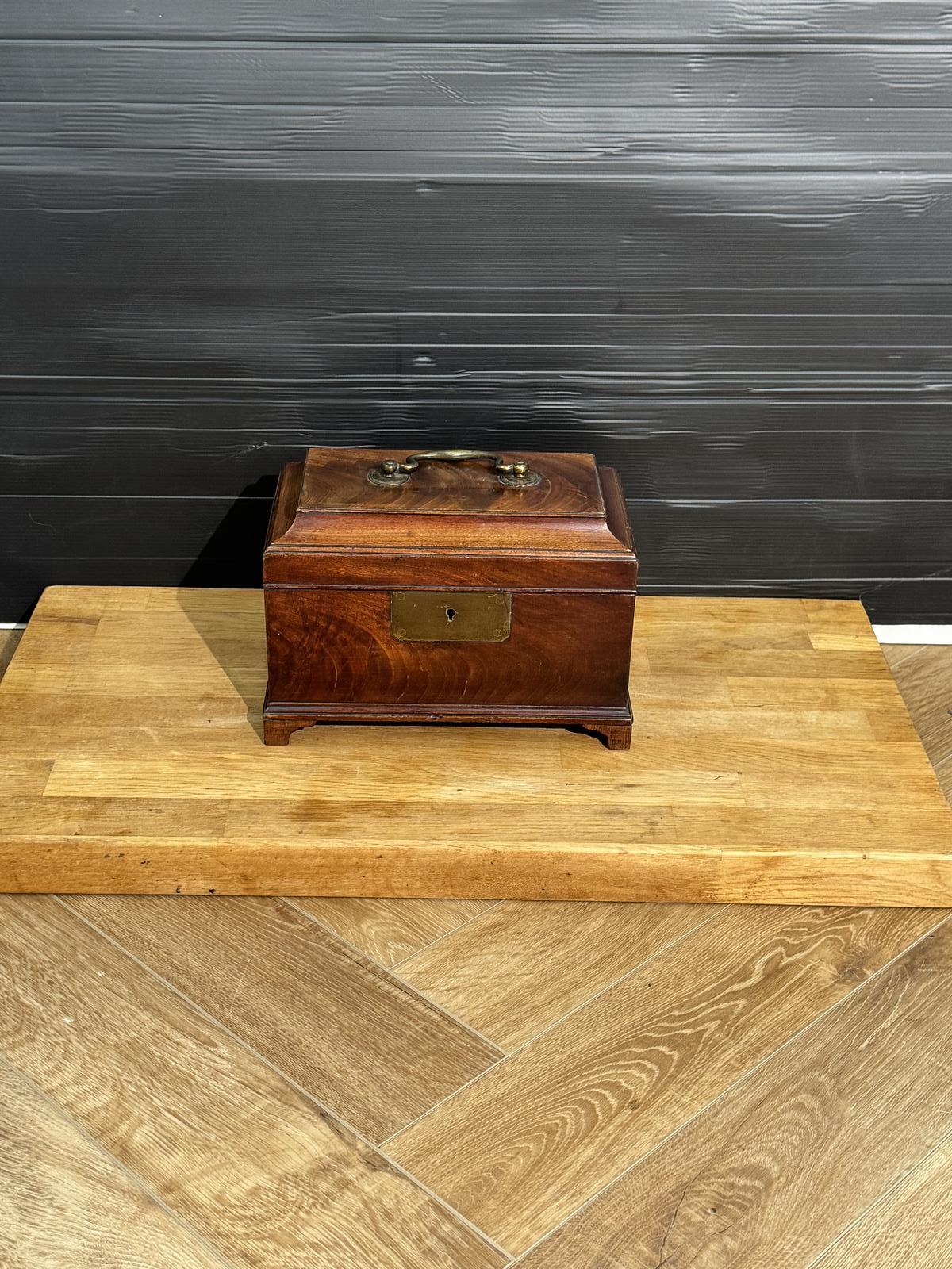 Offered for sale is this Georgian antique mahogany three section restored tea caddy, Bracket feet and caddy lids are replacements. Brass handle and front lock plate.
