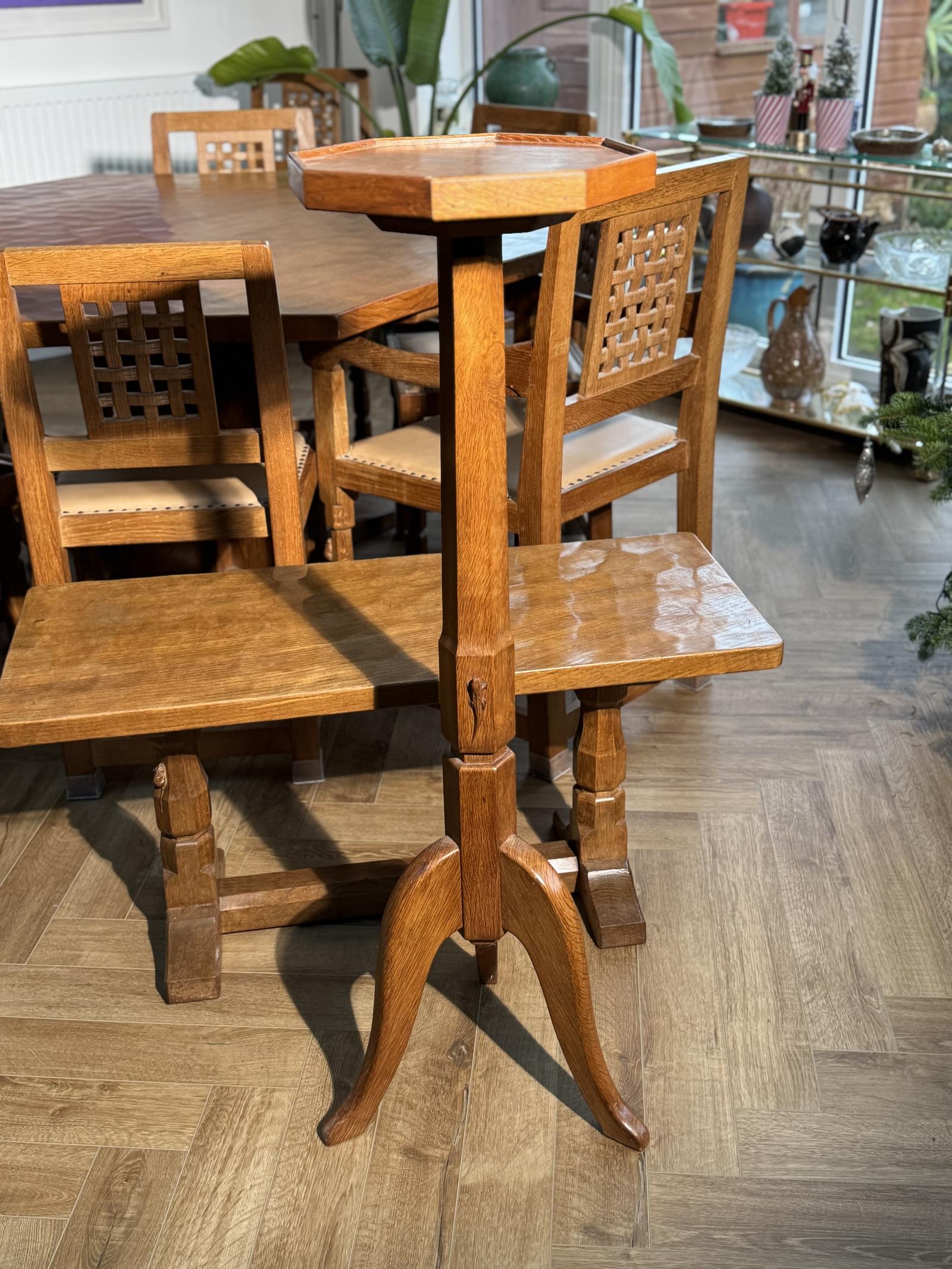Derek Slater (Lizard man) who was from Yorkshire and manufactured oak furniture in the manner of Robert Thompson (Mouseman). This stand is made of oak and has his trademark Lizard carved just above the legs.