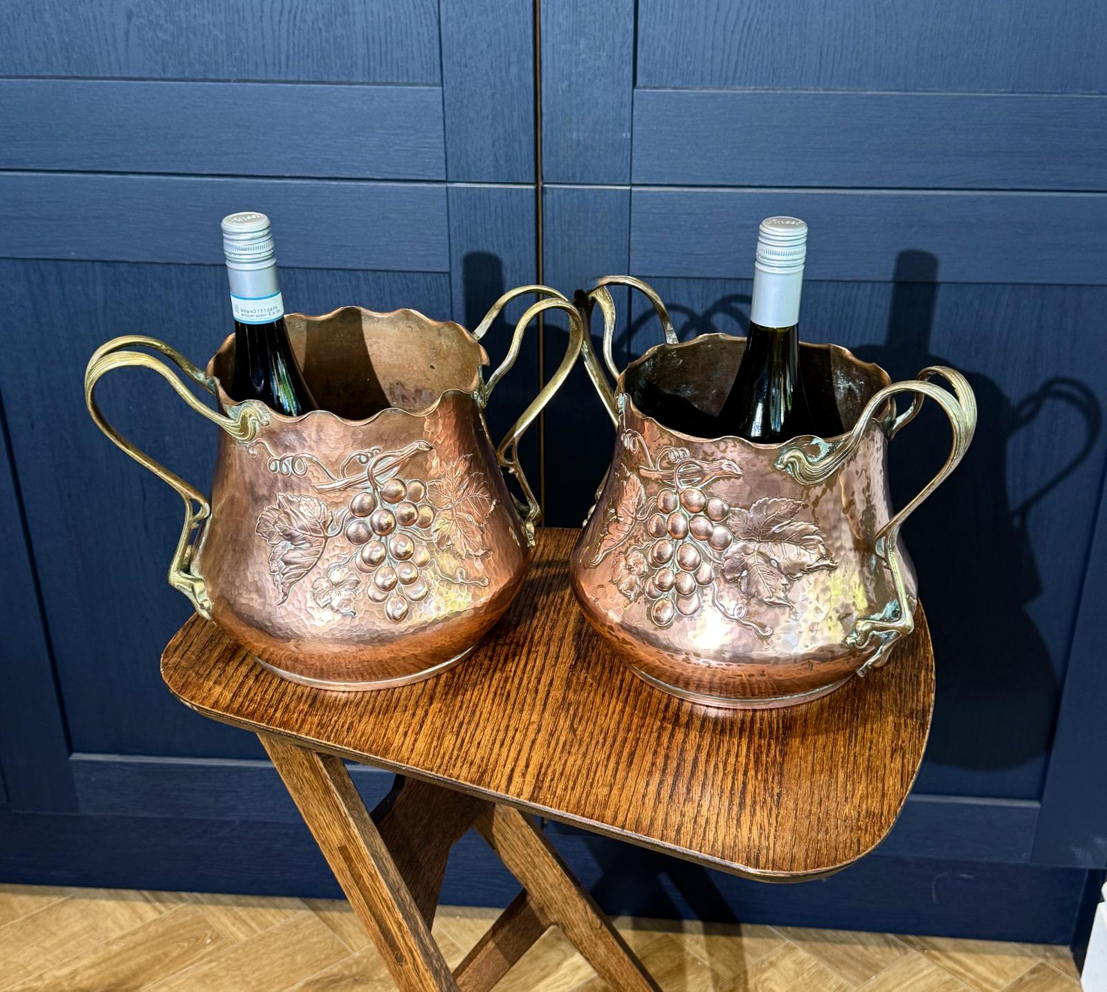 Pair of stylised copper and brass wine coolers /jardinières with embossed grapes and floral decorations on the front covered in hammered copper and beautiful stylised brass handles. They are the same pattern both with different levels of age related wear and unusually have different makers mark underneath. German and one has a pattern pending mark.