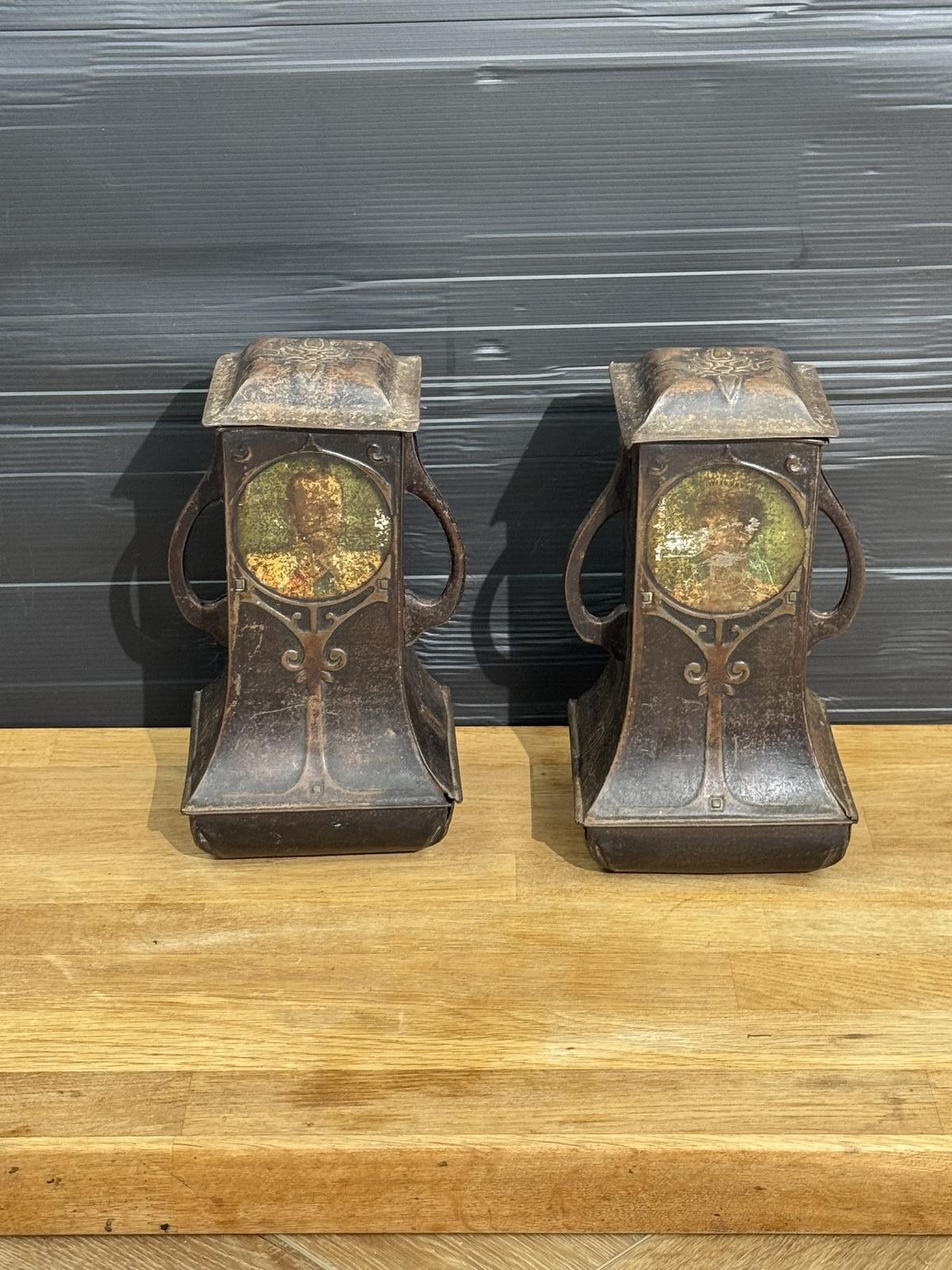 Pair of Art Nouvea tins with worn out painted figures in circular panels. Art nouveau motifs on all sides and on both lids. They have gilded bases and show signs of age.