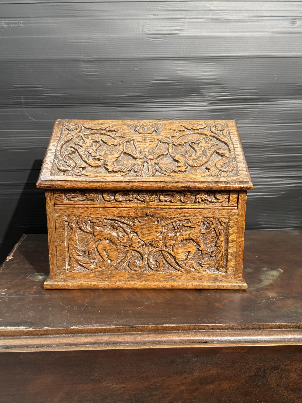 Late 19th Century Victorian antique oak stationary box with different and interesting carved scenes on the front, flap and both sides.