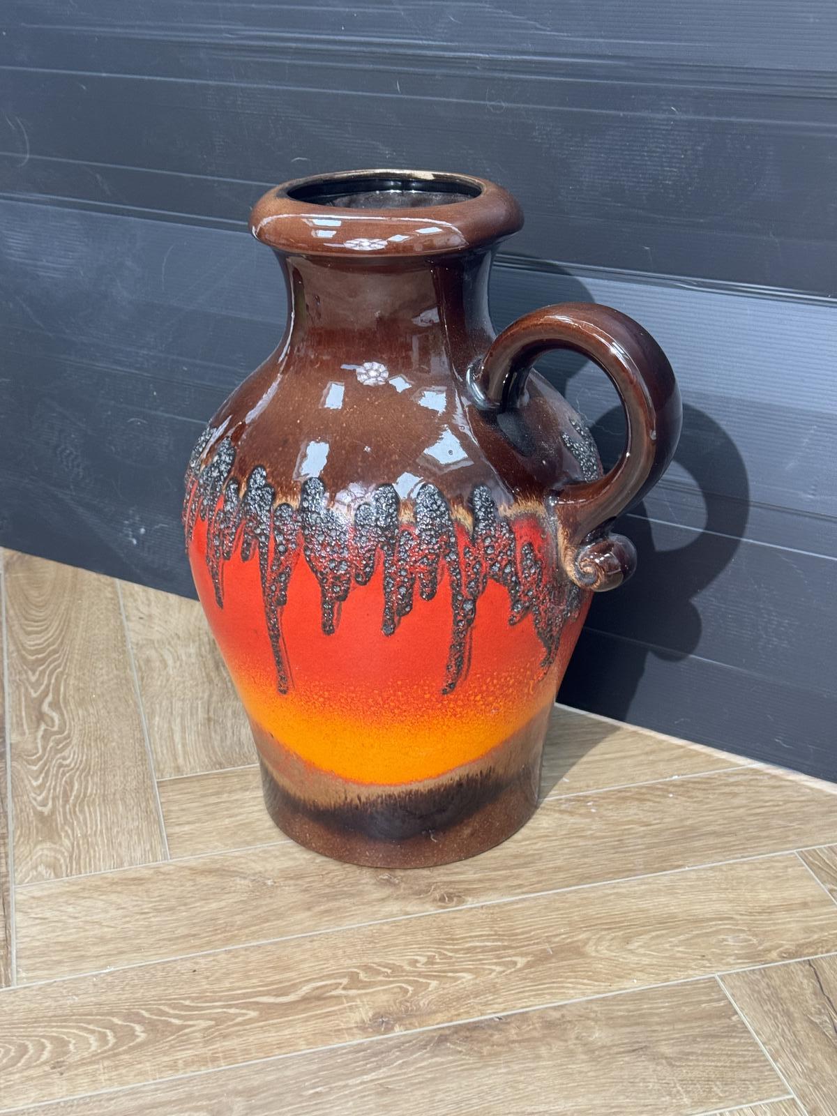 Offered for sale is this 1960s West German lava vase in a brown glaze dripping into the sunburst middle section. It is stamped W. Germany 490-42.
